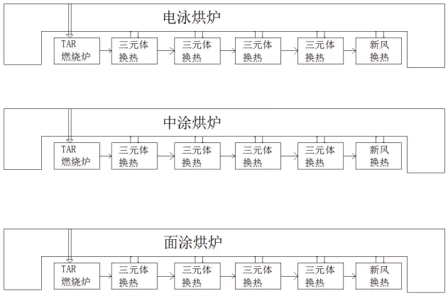 每条烘干室设一台大风量焚烧炉,焚烧烘干室废气,后拖多台高温烟气换热三元体,给加热段供热,再拖一台新风换热器,换热新风送至风幕两端,并作为烘干室的负压补充,构成一套完整的烘干供热系统。经过多台三元体换热后,排空废气温度较低,节能。